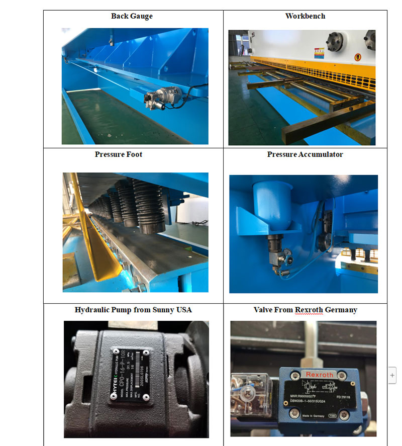 4. De bewegende baan van de bladbalken helt naar voren naar het steunoppervlak van het onderste blad, zodat u een fijn afschuifoppervlak kunt krijgen. De vijzelschroeven van het bovenblad zorgen voor een fijne afstelling om "vodden" of "bramen" op de geschoren rand van het materiaal te minimaliseren. De neerhouder keurt de vlinderveren goed. Er is een antislip hielblok op het neerhoudapparaat van de neerhoudplaat. De druk is groter, maar het beschadigt het plaatwerk niet.